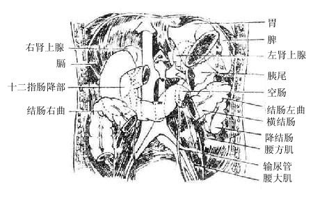 腹膜后腔是指腹后壁腹膜与腹后壁的腹内筋膜之间的间隙,上达膈肌,下抵骶胛,两侧向外接连腹膜外脂肪。间隙内充以疏松结缔组织,主要结构有位于脊柱前方的腹主动脉及其分支;下腔静脉及其属支;脊柱两侧的腰交感干,以及围绕腹腔干和肠系膜上动脉周围的腹腔神经丛,还有腹主动脉神经丛、肠系膜下丛和上腹下丛等植物神经丛;再向两侧为左、右肾和肾上腺以及输尿管。胰和12指肠虽也位于此间隙内,但已述于前。此外还有位于腰大肌深面的腰丛及其分支。